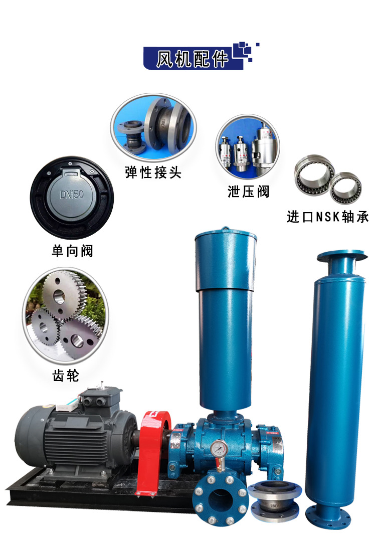 羅茨風(fēng)機(jī)包含的配件:主動輪,從動輪,齒端,驅(qū)端,缸體,軸承壓板,軸套,調(diào)整墊,鍵,齒輪,油罩,油封,軸承,防塵蓋,齒輪壓板,油鏡,磁堵,呼吸器,齒輪油,潤滑脂,螺栓。整機(jī)(機(jī)頭,機(jī)架,電機(jī),進(jìn)口消音器,出口消音器,皮帶輪,皮帶,螺栓,螺母)。