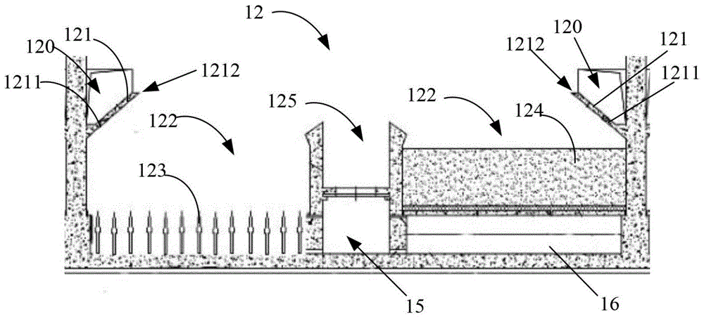 參見圖1和圖2,v型濾池包括進(jìn)水總渠和多個濾池本體12,每個濾池本體12包括v型槽121、濾池部122、排水渠125、長柄濾頭123和均質(zhì)濾料124等,排水渠125的端壁上開設(shè)有排污口1251。v型濾池的過濾工作原理是:由進(jìn)水總渠流入經(jīng)進(jìn)水閥13流進(jìn)來的待濾水,漫過堰口14經(jīng)兩邊側(cè)孔120進(jìn)入兩側(cè)v型槽121,從v型槽121槽底的配水孔1211和v型槽121的槽堰1212同時進(jìn)入濾池部122內(nèi)部,再由均質(zhì)濾料濾層124過濾后變?yōu)榍逅?,清水從濾頭123流向底部空間16,又從方孔18匯聚氣水分配管渠15,最后經(jīng)管廊水封井、出水堰、清水管19流向清水池。
